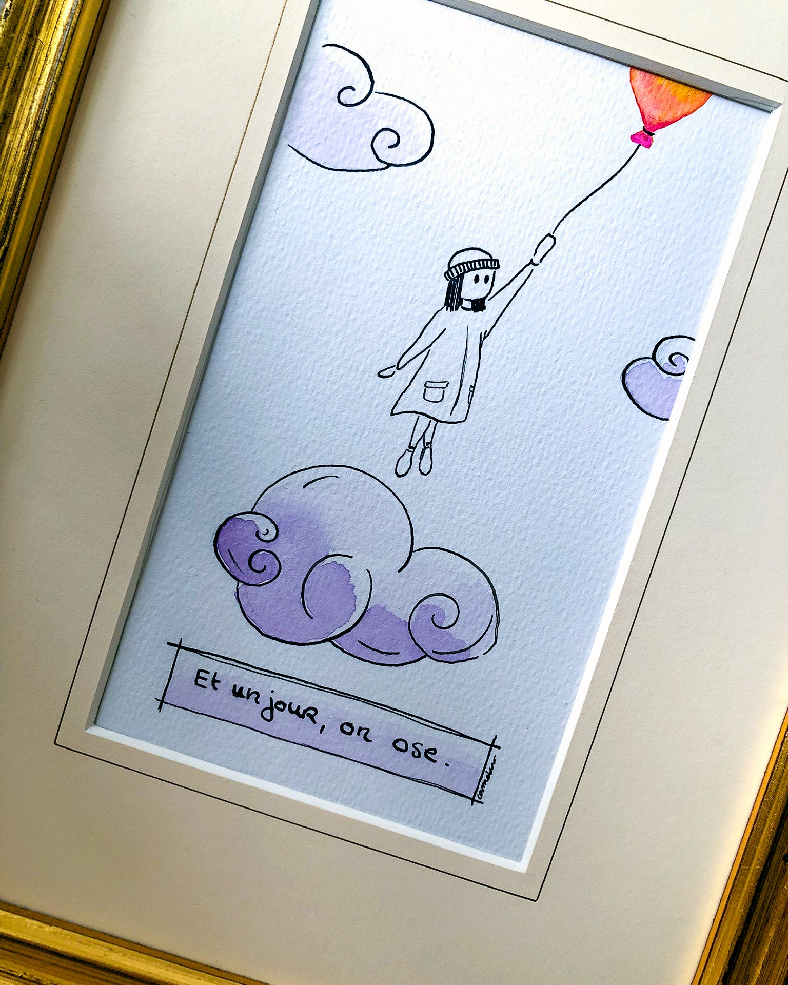 L'œuvre originale "Et un jour, on ose" est vendue dans un cadre que j'ai chiné dans le Sussex, au UK. Elle est prête à poser ou à accrocher. Elle est accompagnée d'un certificat d'authenticité rédigé à la main et signé.
