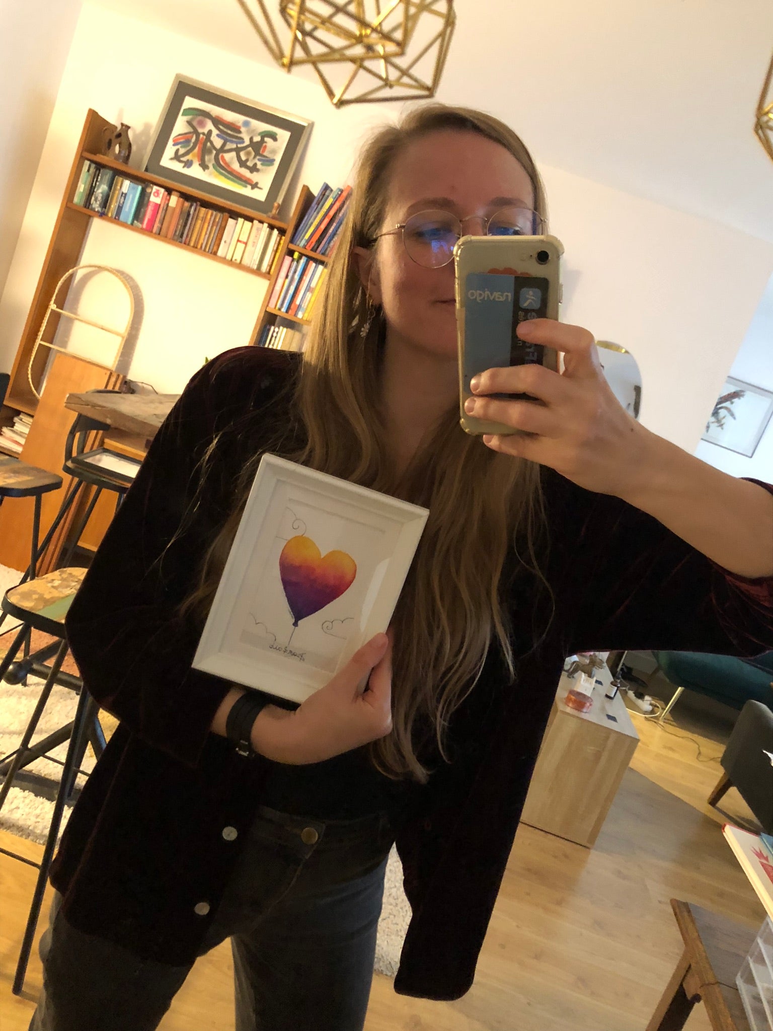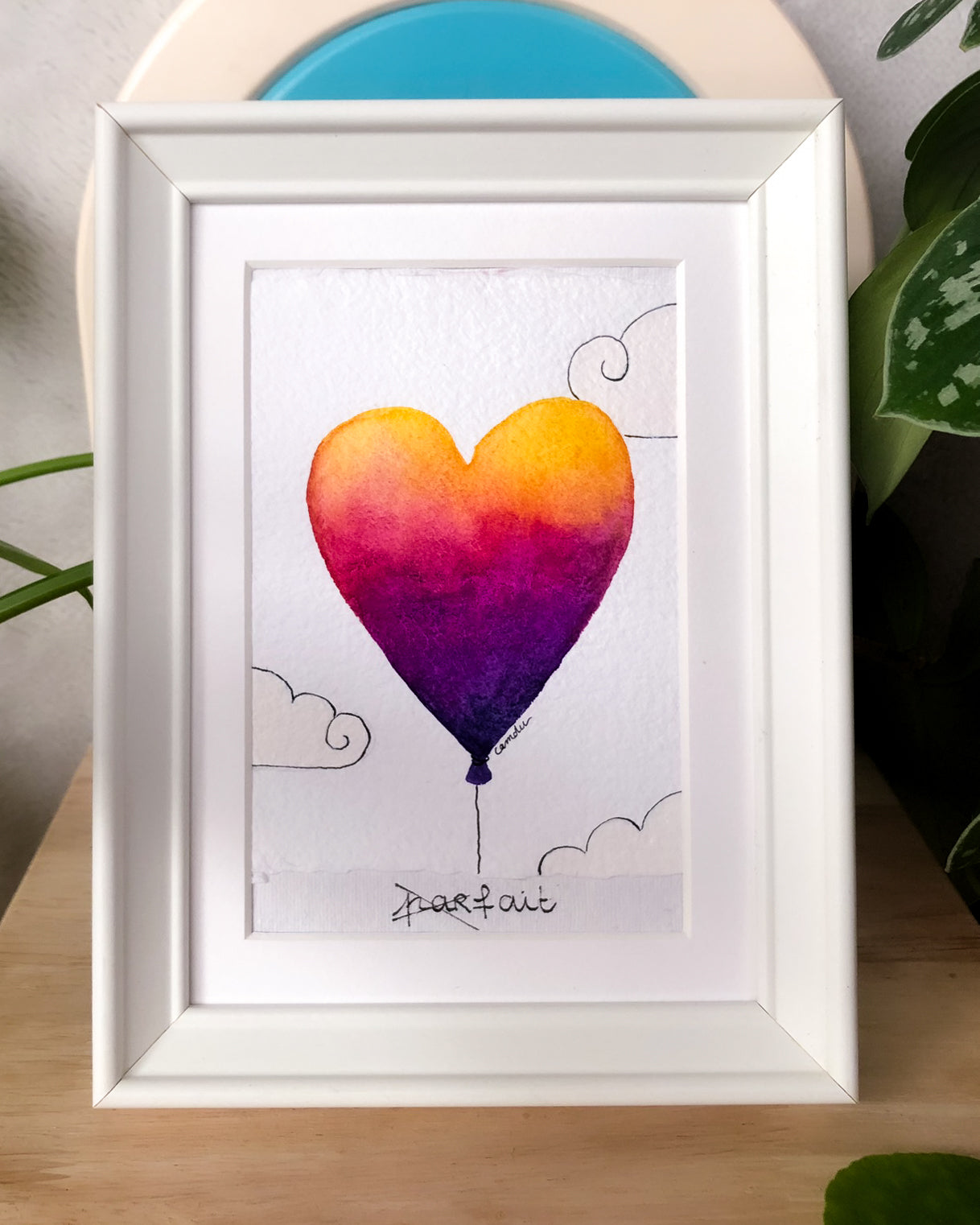 L'œuvre originale "Par-fait" est vendue dans un cadre simple, prête à poser ou à accrocher. Elle est accompagnée d'un certificat d'authenticité rédigé à la main et signé.